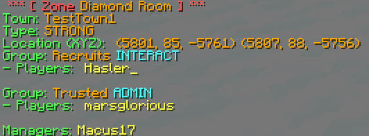You can then set access to the zone either per player or per group. /town zone set-player-access MyTown MyCoolZone build Notch will give the player Notch build permissions in the zone. /town zone set-group-access MyTown MyCoolZone interact Trusted will give anyone in the Trusted group interact permissions in the zone.